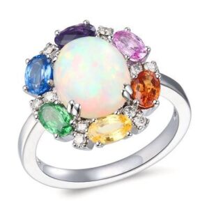 Ringfeaturing17/8cts.NeopolitanOpal,1/3cts.BlueberrySapphire,1/3cts.Spessartite,1/4cts.BubbleGumPinkSapphire,1/4cts.YellowSapphire,1/5cts.DarkAmethyst,1/6cts.ForestGreenTsavorite,1/6cts.NudeDiamondssetin
