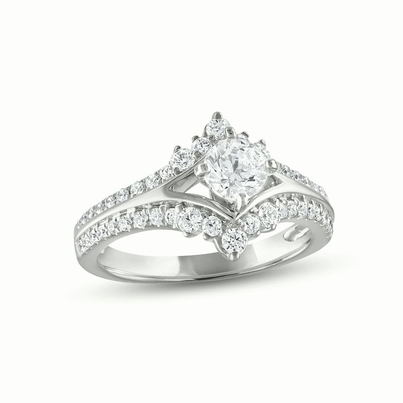 Elegant and enchanting, this engagement ring for her showcases a 1/2-carat round center diamond that sparkles between chevrons of cool 14K white gold. Shimmering round diamonds add allure to the edges and sweep down to adorn the band. The ring has a total diamond weight of 1 carat.
