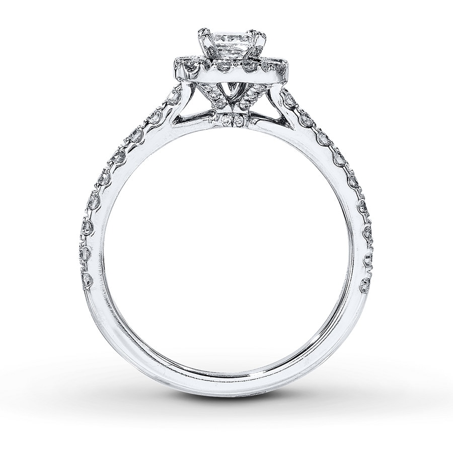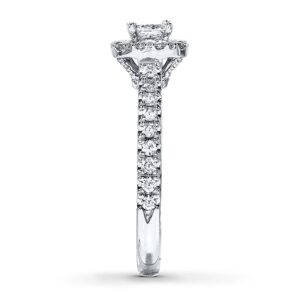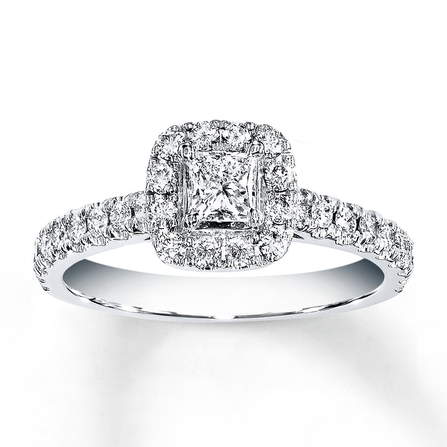 A princess-cut diamond takes center stage in this dramatic engagement ring for her.A supporting cast of round diamonds frames the center and lines the band of 14K white gold for a design worthy of applause. The ring has a total diamond weight of 7/8 carat.